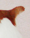 The photos above are three different dogs' ears. The first (left) is ungroomed, and typical of what many Brittanys will grow on their ears. Comb and cut the featherings even with the ear leather as described above. The second (middle) photo shows how the ear should look after this is done. The third (right) photo is a finished ear -- note that this dog does not grow a lot of feathering on the ear, so not a lot of thinning was needed as would be done on the first two dogs, to shorten the hair overall, but all ears should have this appearance in the end, with feathering about an inch long at the top of the ear, shortening towards the tip.